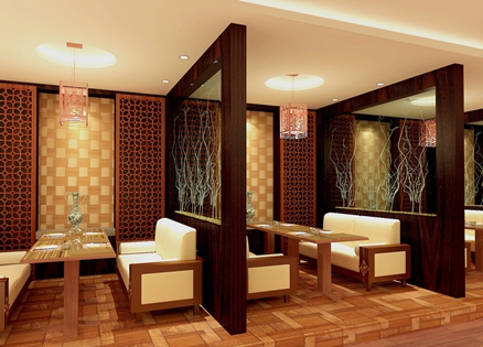 第二、隔斷應用。在酒店裝修設計中隔斷的應用目的不是在于空間切斷,然而它是一個過渡,一個提醒、一個指示,常常“隔而不斷”。碧紗櫥、落地罩、飛罩、屏風、博古架、帷幕,不但用來“隔而不斷”,還有很強的裝飾性。例如中央采用透空木隔斷,形成豐富的環(huán)境視覺效果。兩旁附以玻璃做的矮架。在分隔座椅時,又采用木制和玻璃的隔斷體現了豐富的層次感。